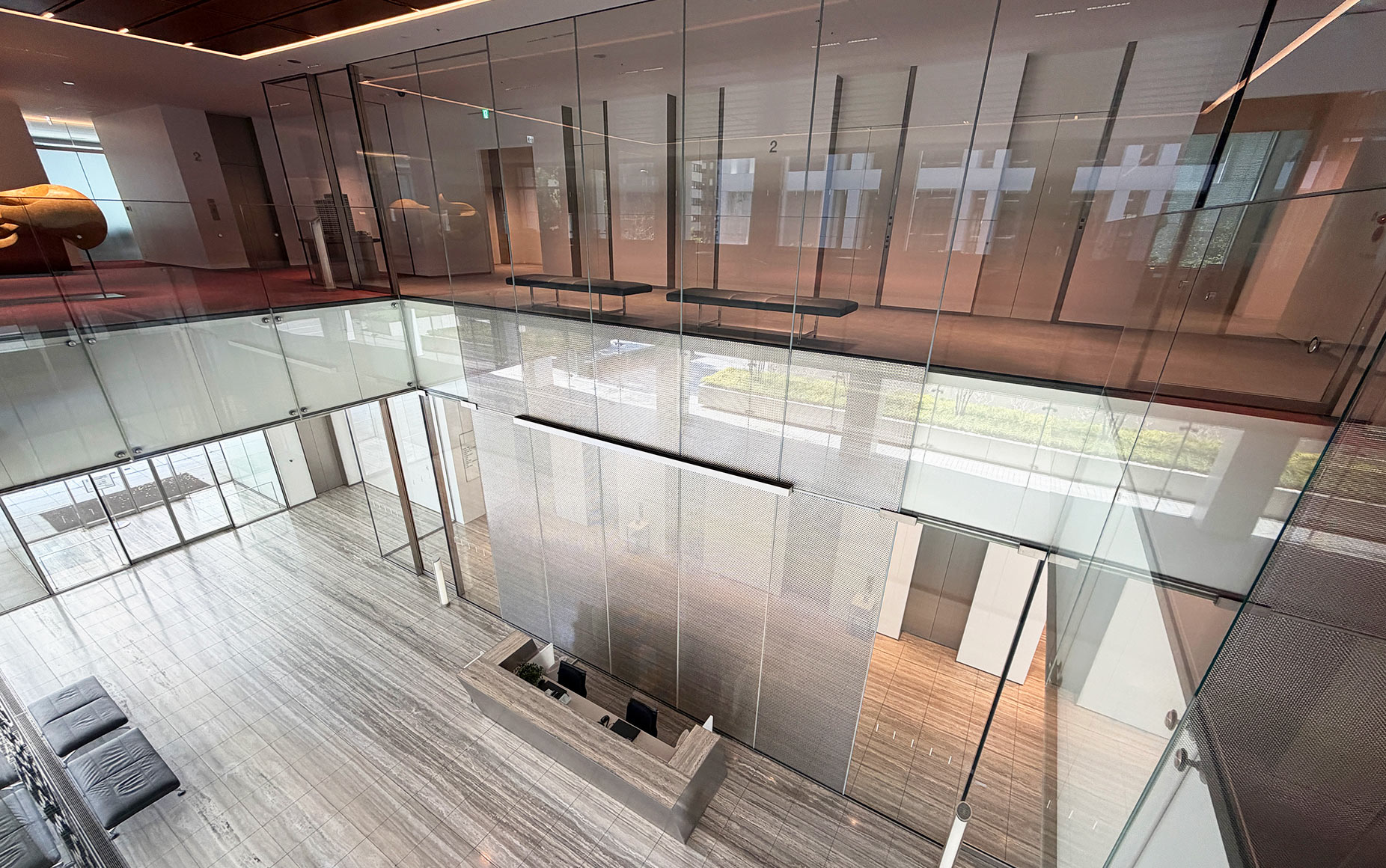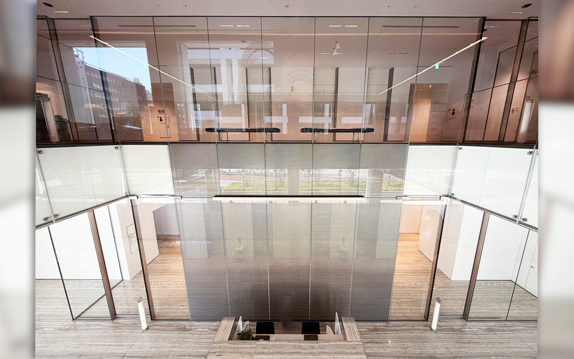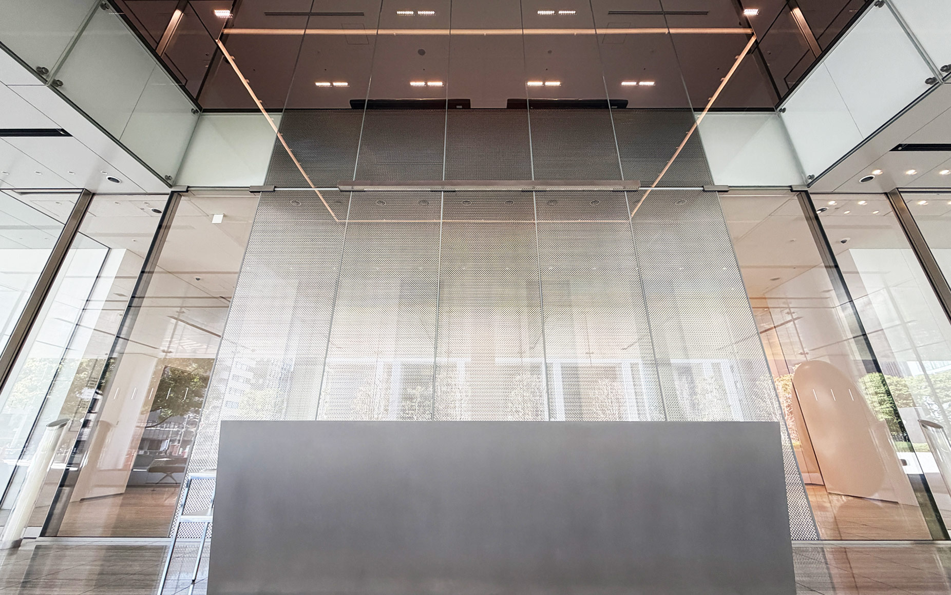 | 納入製品 | 高透過 強化 メタルメッシュ入り合わせガラス ▼ 1階部分(エントランスホール・EVホール) 寸法:W1274×H4165 数量:5枚 ▼ 2階部分(EVホール・吹き抜け) 寸法:W1274×H4540 数量:5枚 部分メッシュ |