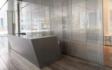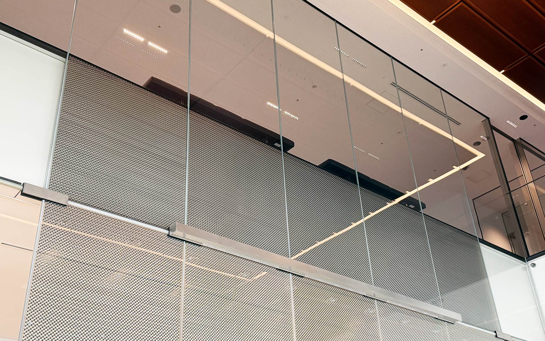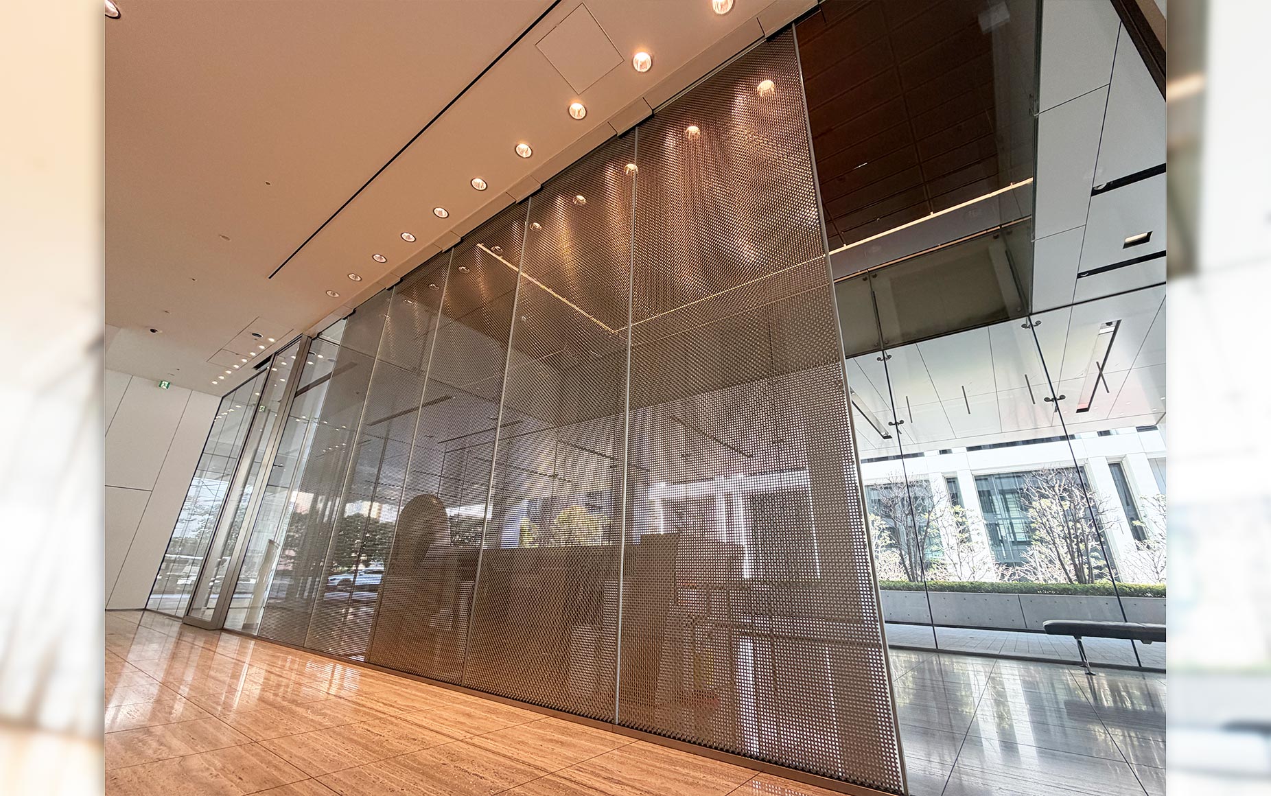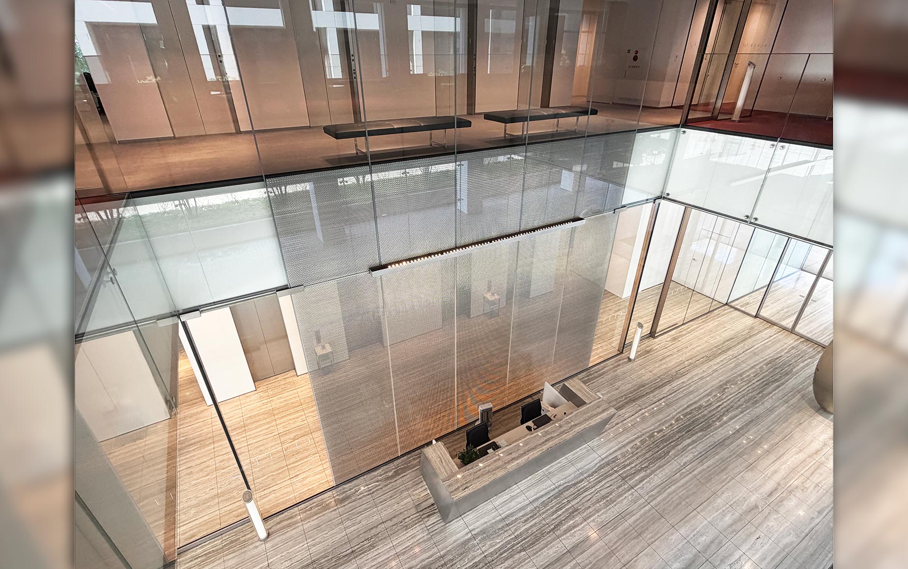 | 納入製品 | 高透過 強化 メタルメッシュ入り合わせガラス ▼ 1階部分(エントランスホール・EVホール) 寸法:W1274×H4165 数量:5枚 ▼ 2階部分(EVホール・吹き抜け) 寸法:W1274×H4540 数量:5枚 部分メッシュ |