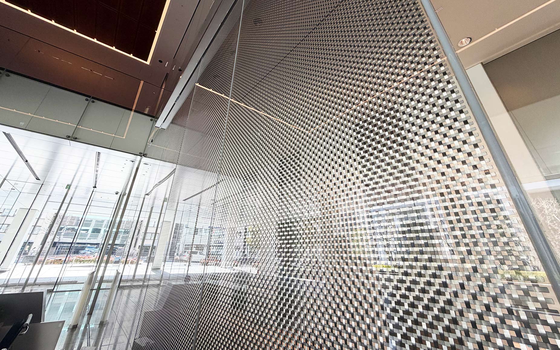 合わせガラスの中間層にステンレス製クリンプ金網を封入しています。